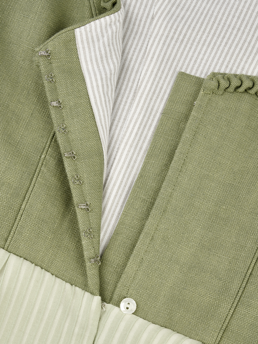 Das Dirndl Delia in warmem Salbeigrün überzeugt mit klassischen Details und einem modernen Touch. Das Leinenmieder mit Herzausschnitt ist von einer handgezogenen Herzrüsche eingefasst und wird mit einer Hakenleiste geschlossen. Der weich fallende Plisseerock bringt Leichtigkeit und Bewegung in den Look, die Ton-in-Ton-Schürze fügt sich harmonisch ins Gesamtbild ein.