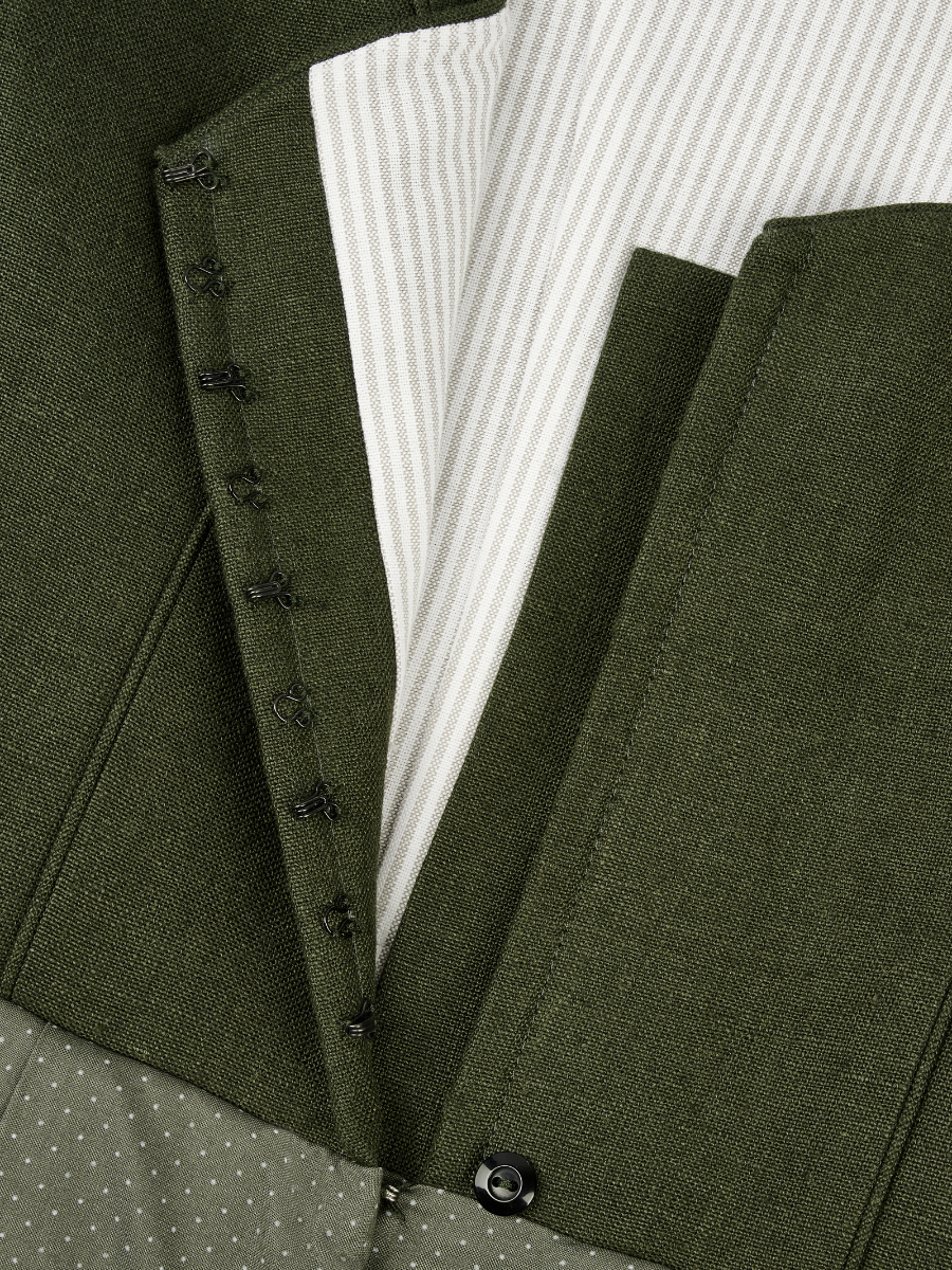 Dirndl Liselotte überzeugt mit schlichter Eleganz in Olivgrün. Das Leinenmieder mit Herzausschnitt wird mit einem Baumwollrock mit zartem Punktmuster kombiniert. Eine Schürze in einem helleren Grünton ergänzt den Look stimmig.